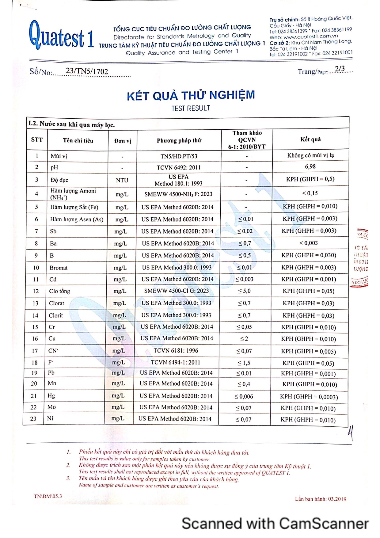 KẾT QUẢ THỬ NGHIỆM NƯỚC MÁY NANO GEYSER ECO LUX