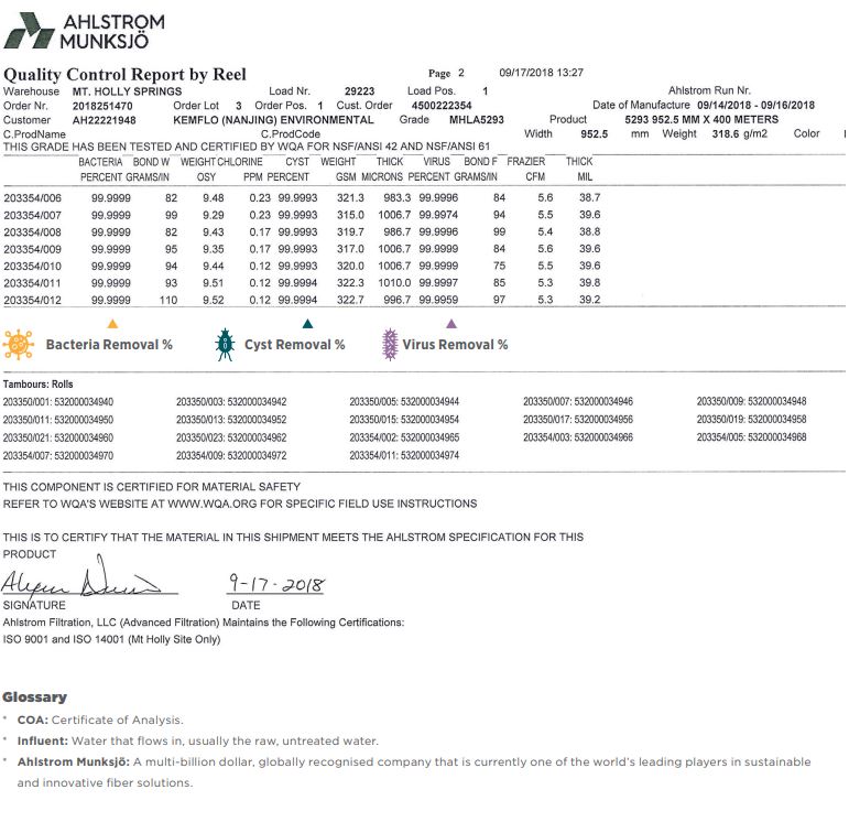 CÁC CHỨNG CHỈ ĐẠT ĐƯỢC CỦA MÀNG LỌC NANO DISRUPTOR