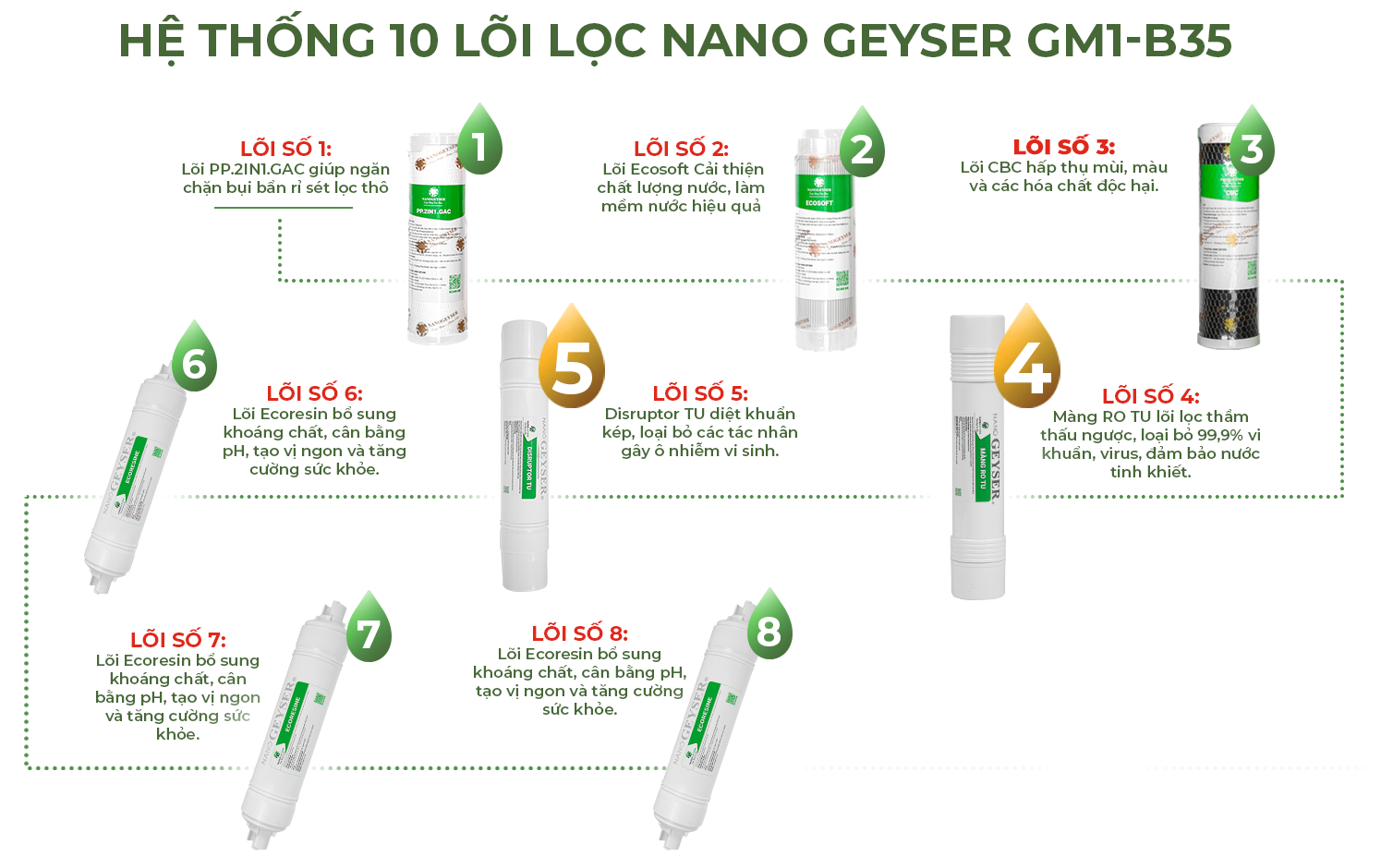 Hệ thống 8 lõi lọc của GM1-B35 được thiết kế để xử lý nước một cách toàn diện và hiệu quả: