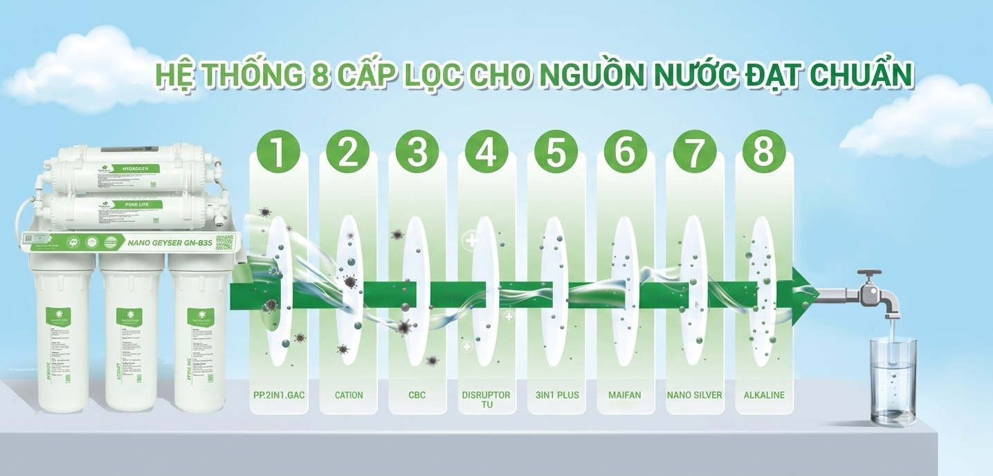 Máy lọc nước Nano Geyser GN-B35 8 cấp là mẫu sản được tích hợp công nghệ lọc số 1 tại Mỹ Nano Disruptor giúp đảm bảo nguồn nước SẠCH - AN TOÀN - ĐẠT CHUẨN - GIÀU KHOÁNG CHẤT TỰ NHIÊN.