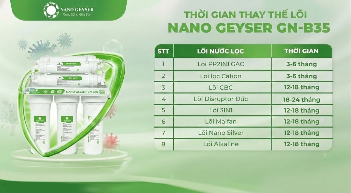Để duy trì hiệu suất lọc tối ưu và đảm bảo chất lượng nước luôn đạt chuẩn uống trực tiếp, việc thay lõi lọc đúng định kỳ là vô cùng quan trọng. Mỗi lõi trong hệ thống máy lọc nước Nano Geyser đảm nhận một chức năng riêng biệt — từ loại bỏ tạp chất, hấp phụ hóa chất đến diệt khuẩn và tái khoáng. Vì vậy, tuân thủ lịch thay lõi không chỉ giúp kéo dài tuổi thọ máy mà còn đảm bảo nguồn nước tinh khiết, an toàn cho sức khỏe cả gia đình.