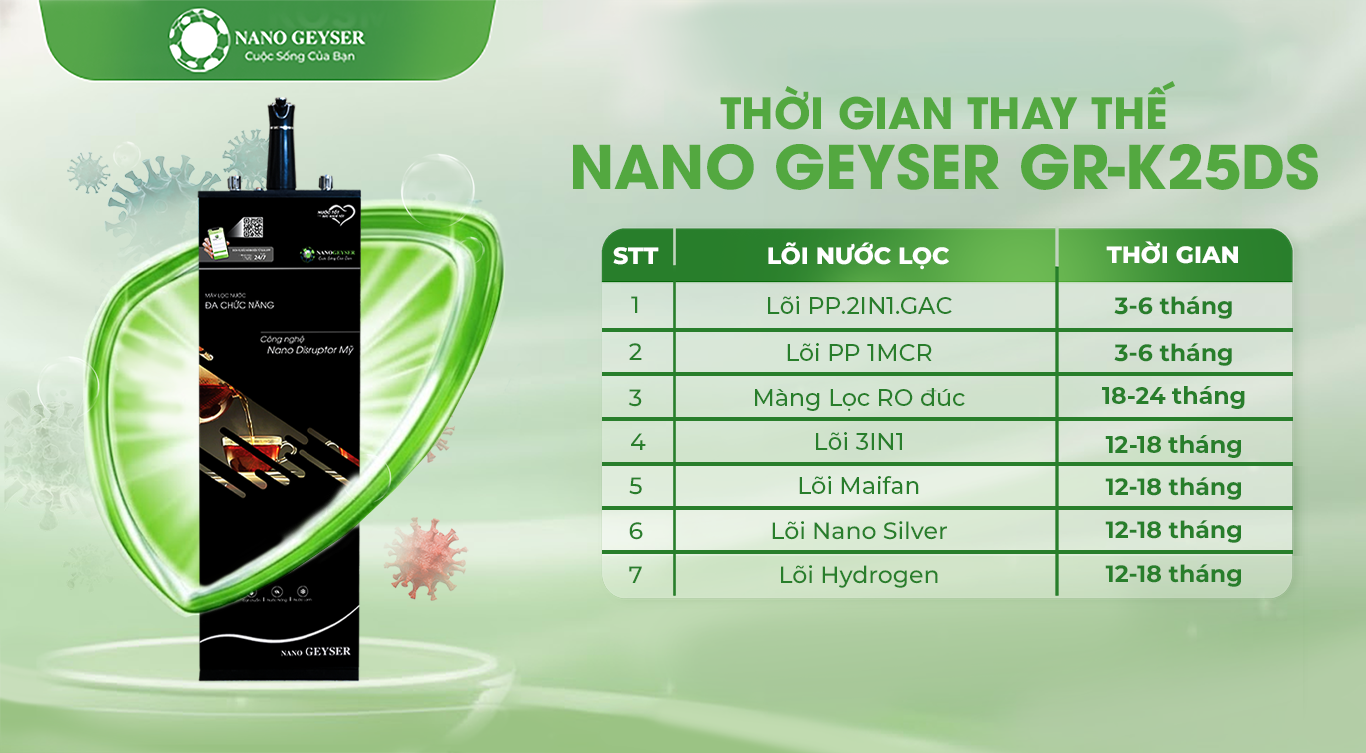 Để duy trì hiệu suất lọc tối ưu và đảm bảo chất lượng nước luôn đạt chuẩn uống trực tiếp, việc thay lõi lọc đúng định kỳ là vô cùng quan trọng. Mỗi lõi trong hệ thống máy lọc nước Nano Geyser đảm nhận một chức năng riêng biệt — từ loại bỏ tạp chất, hấp phụ hóa chất đến diệt khuẩn và tái khoáng. Vì vậy, tuân thủ lịch thay lõi không chỉ giúp kéo dài tuổi thọ máy mà còn đảm bảo nguồn nước tinh khiết, an toàn cho sức khỏe cả gia đình.