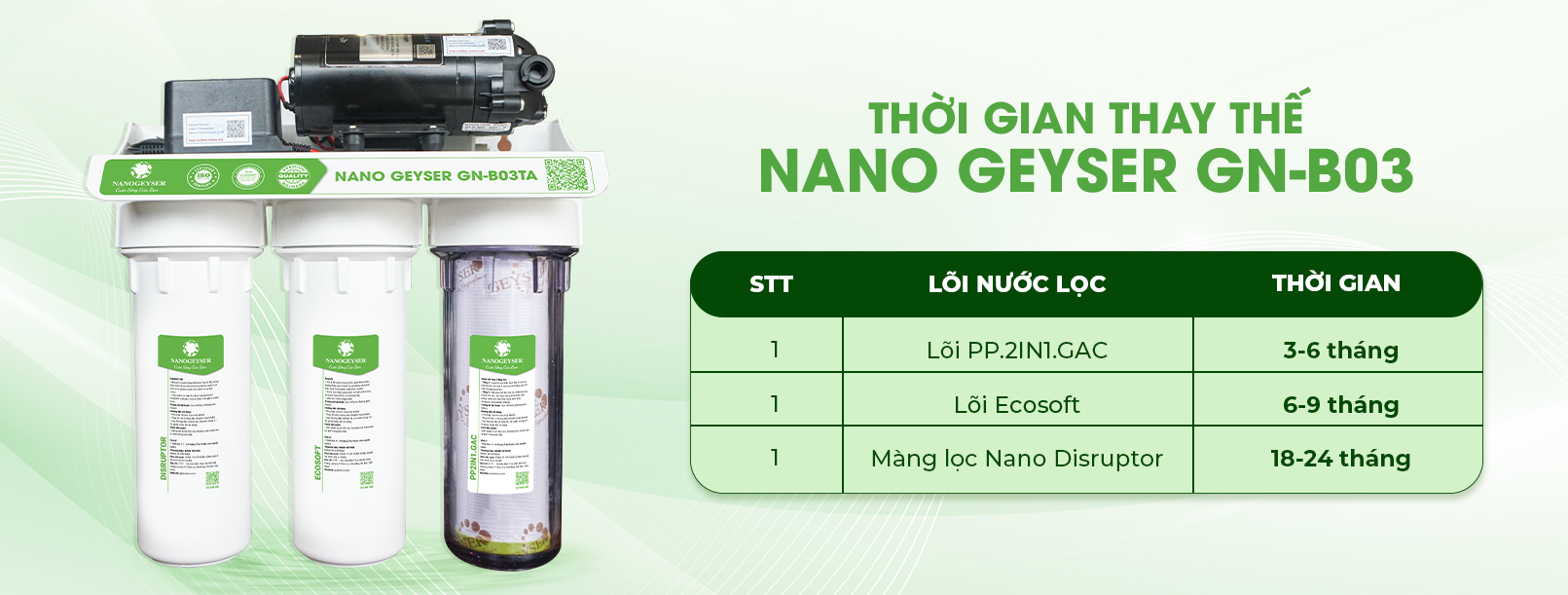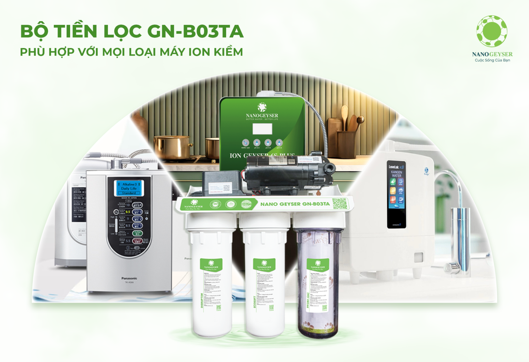 Bộ tiền xử lý cho máy Ion Kiềm Nano Geyser GN-B03TA là sự lựa chọn hàng đầu cho tất cả các dòng máy lọc nước ion kiềm điện giải tại Việt Nam, mang lại nguồn nước SẠCH - AN TOÀN - ĐẠT CHUẨN theo tiêu chuẩn nước uống trực tiếp QCVN 6-1: 2010/BYT, đồng thời chống bám cặn điện cực kéo dài và ổn định chất lượng cho máy điện giải Ion Kiềm.