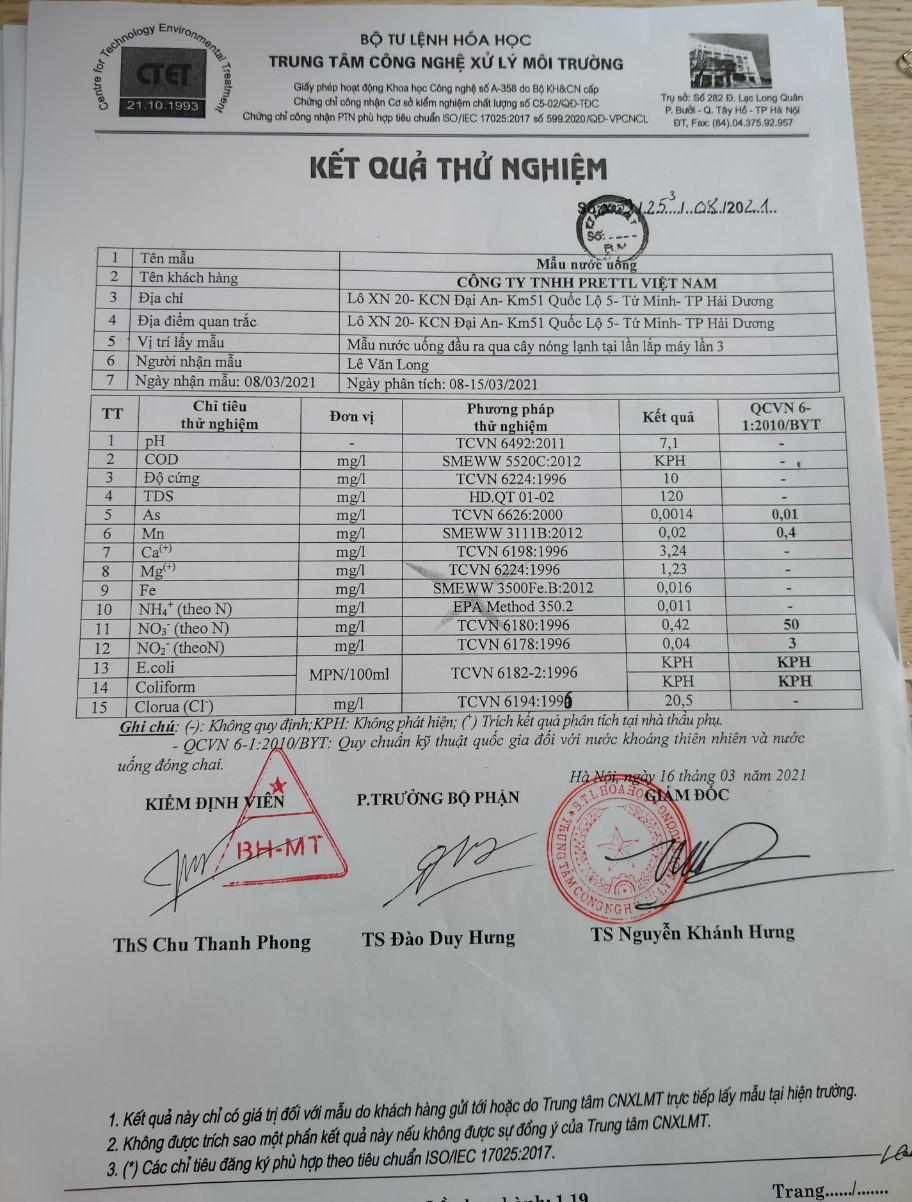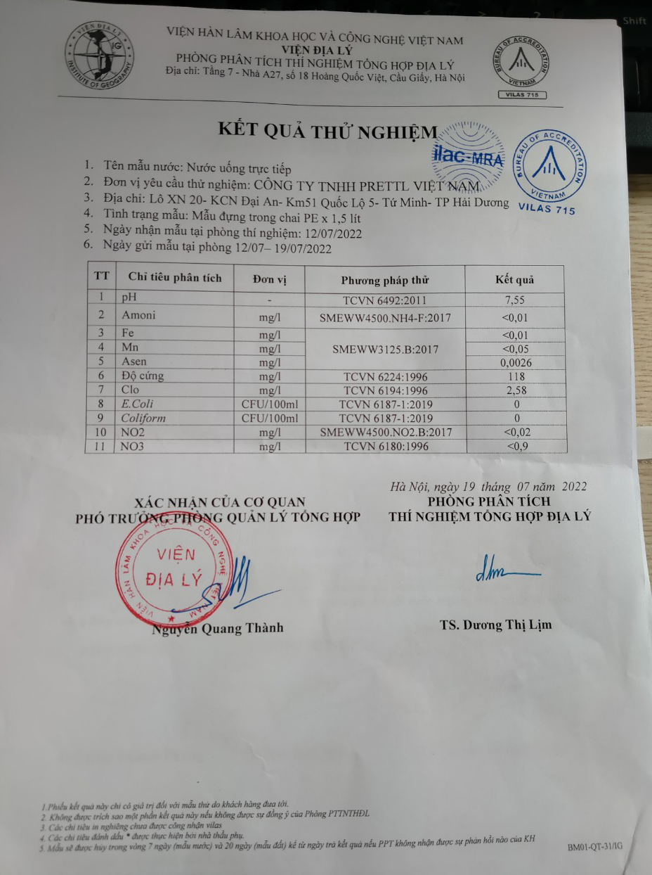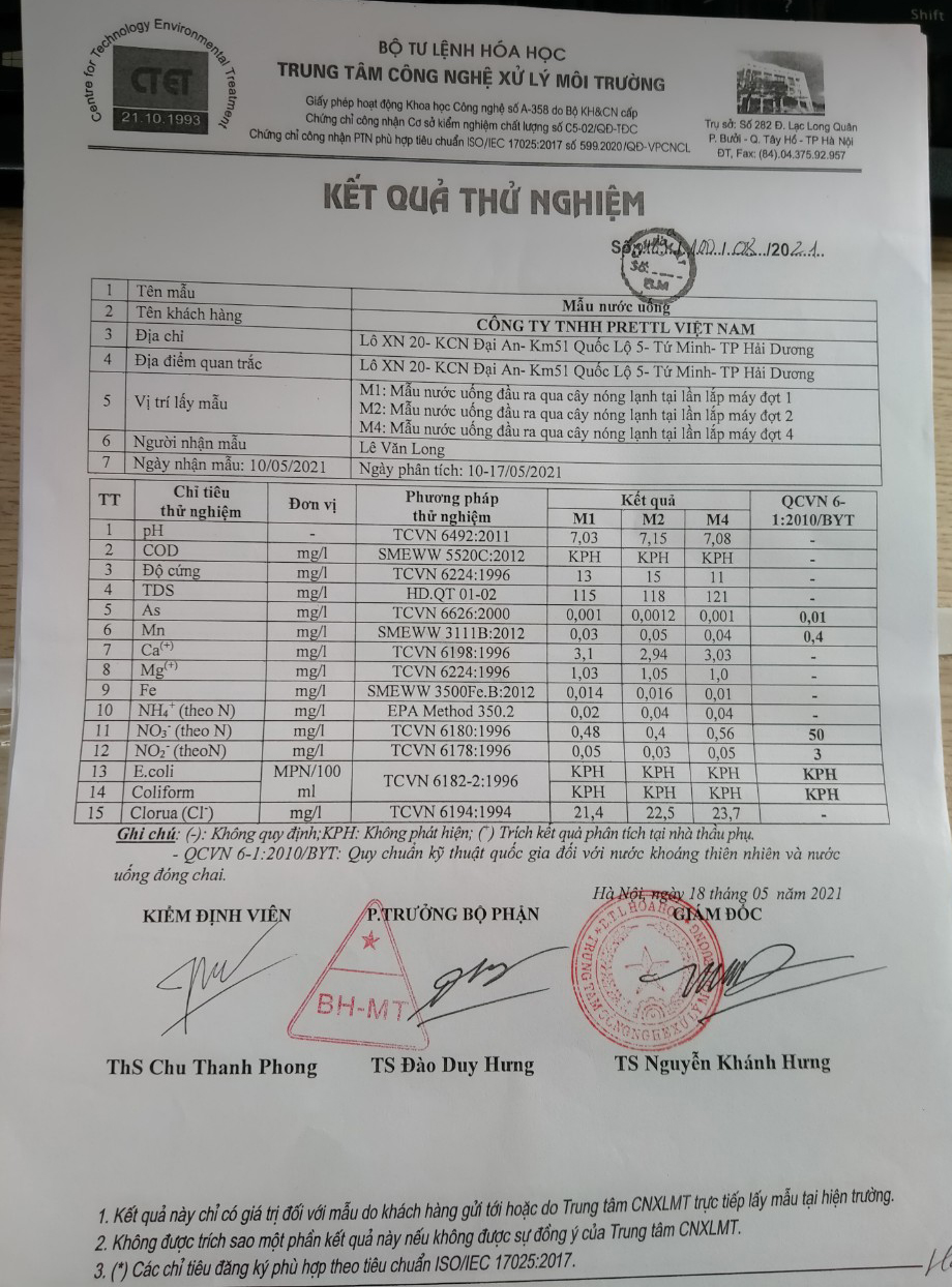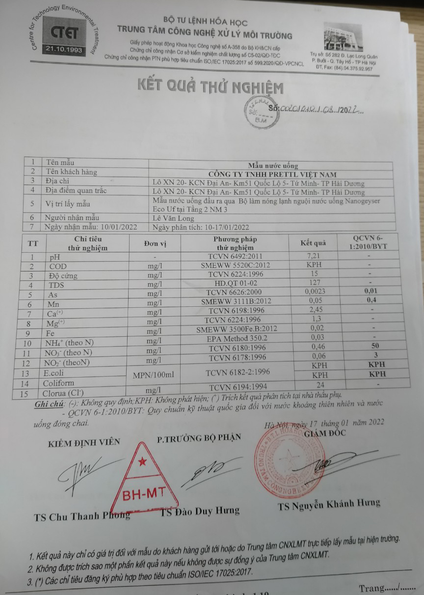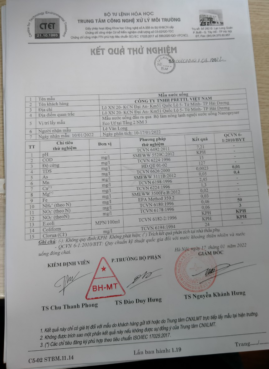 KẾT QUẢ THỬ NGHIỆM MẪU NƯỚC ĐẦU RA BỘ LÀM NÓNG LẠNH NANO GEYSER TẠI NHÀ XƯỞNG