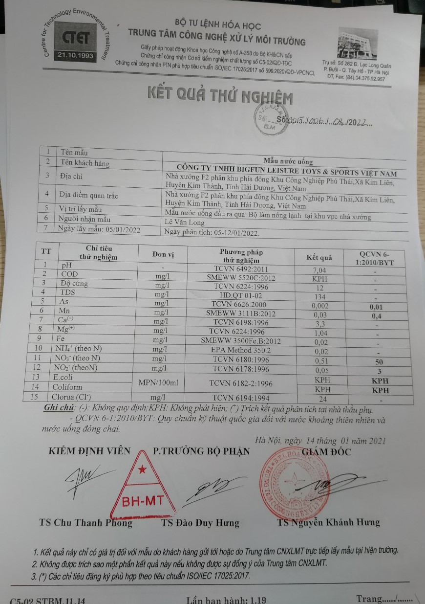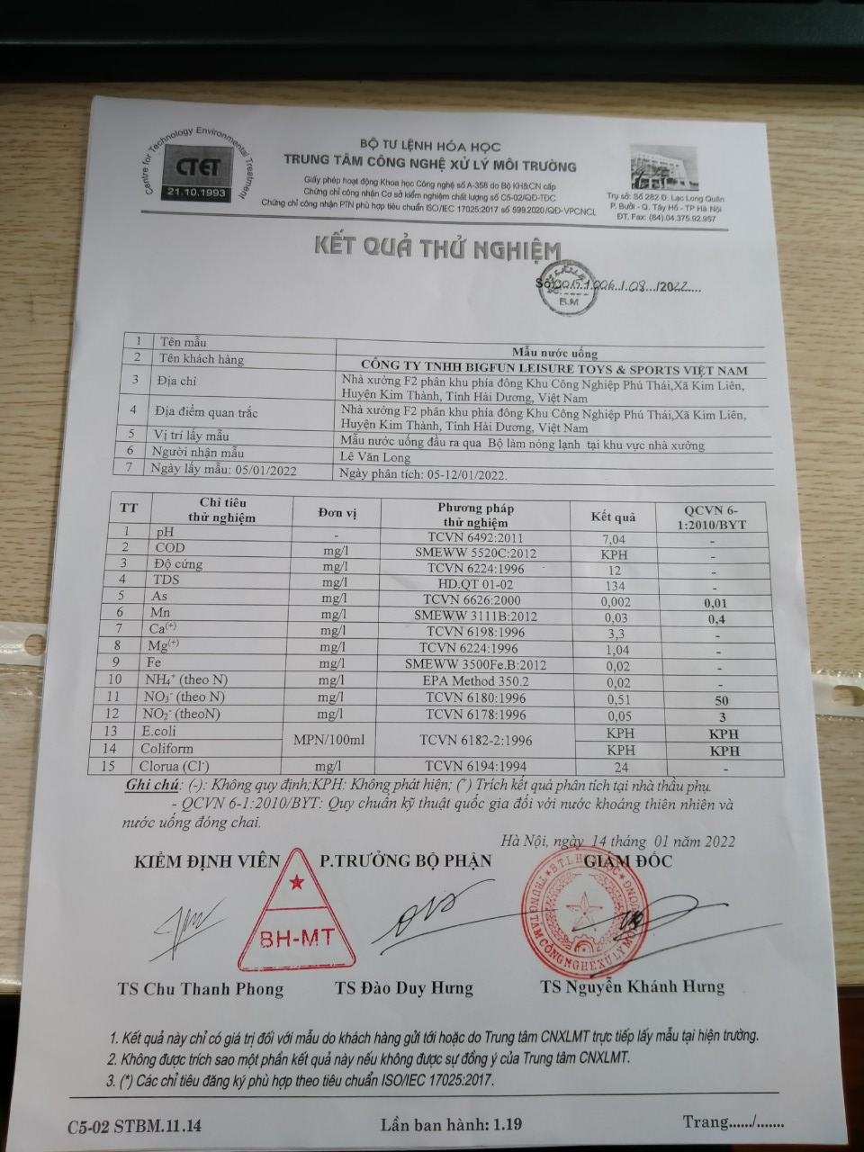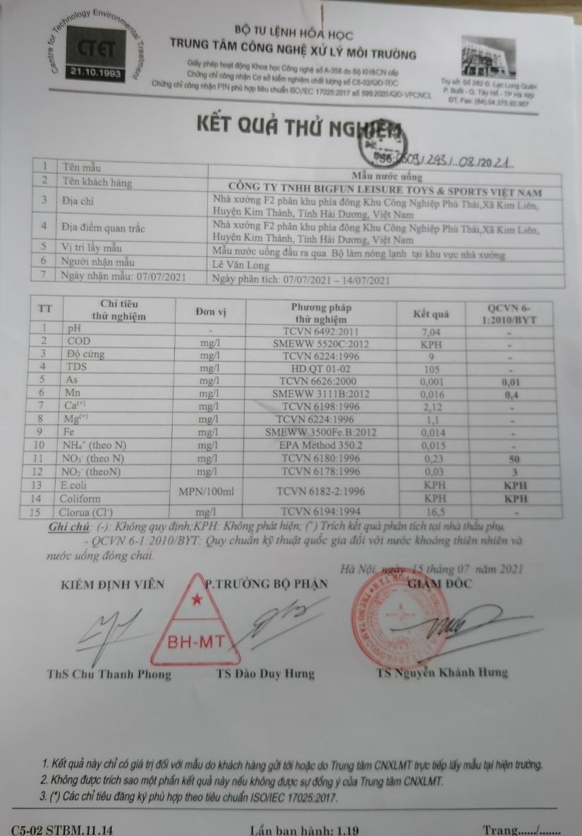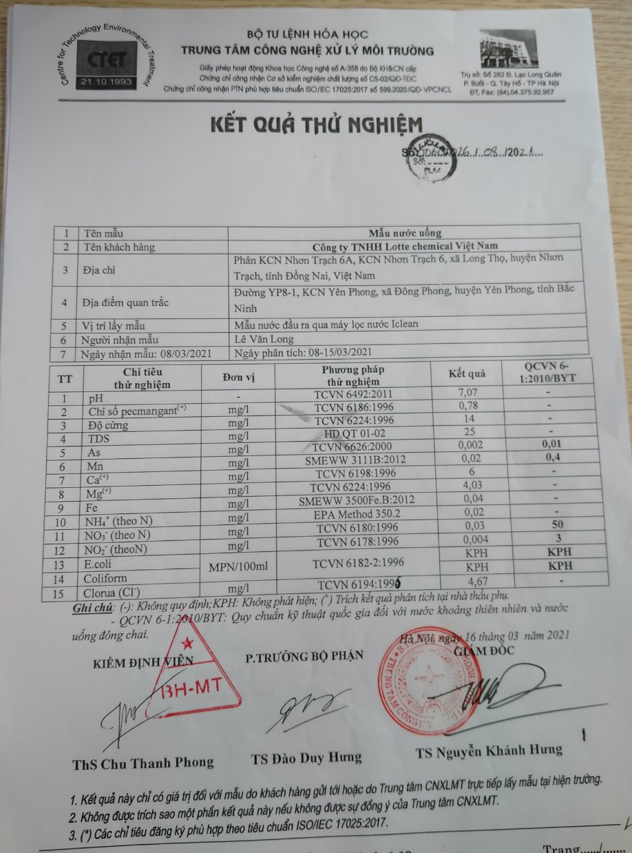 KẾT QUẢ THỬ NGHIỆM MẪU NƯỚC ĐẦU RA BỘ LÀM NÓNG LẠNH NANO GEYSER TẠI NHÀ XƯỞNG