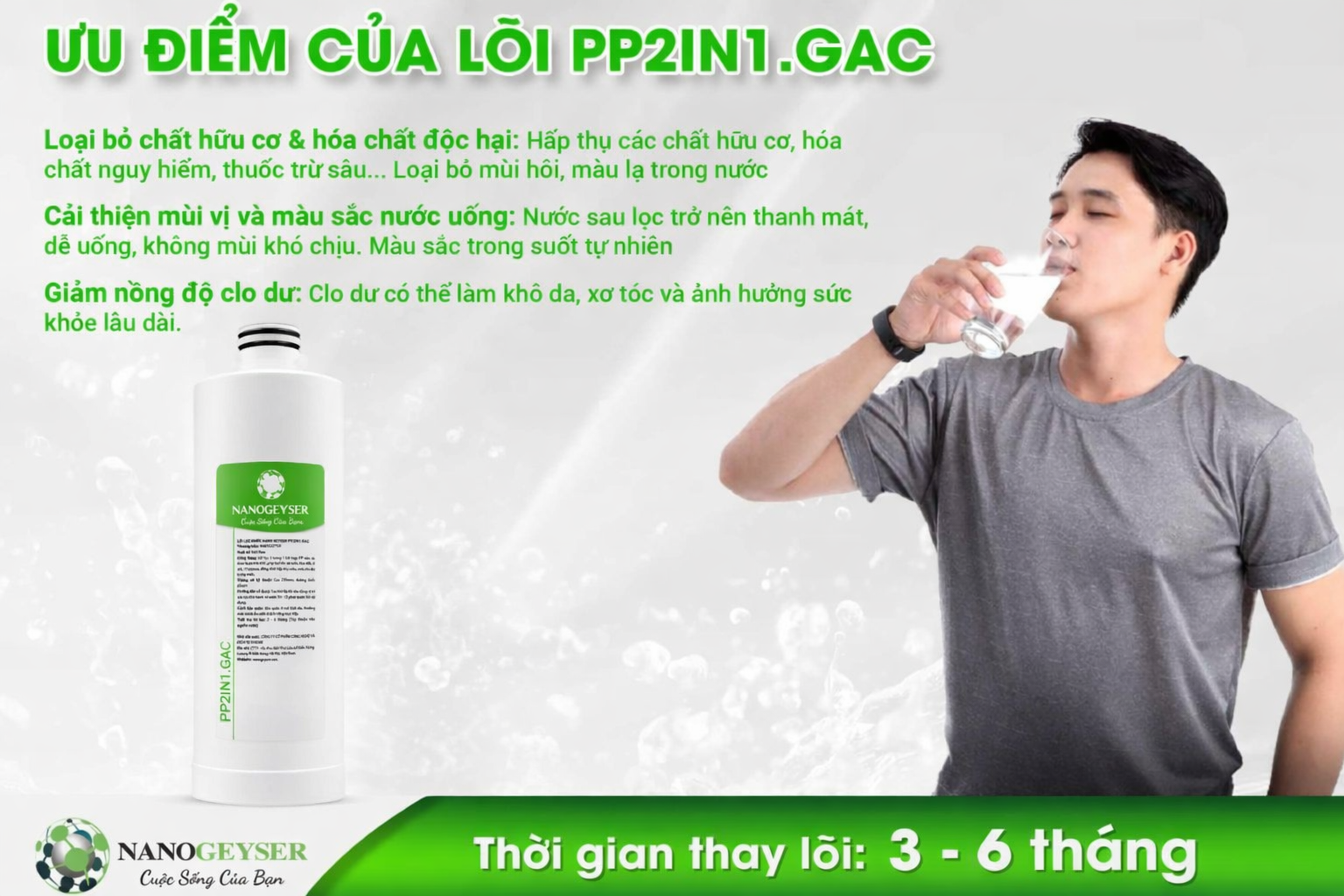 - Cải thiện mùi vị và màu sắc của nước: Nước sau khi lọc qua Lõi lọc nước Nano Geyser CITY FILTER B - PP2IN1.GAC sẽ có mùi vị trong lành, dễ uống hơn và màu sắc trong suốt hơn.