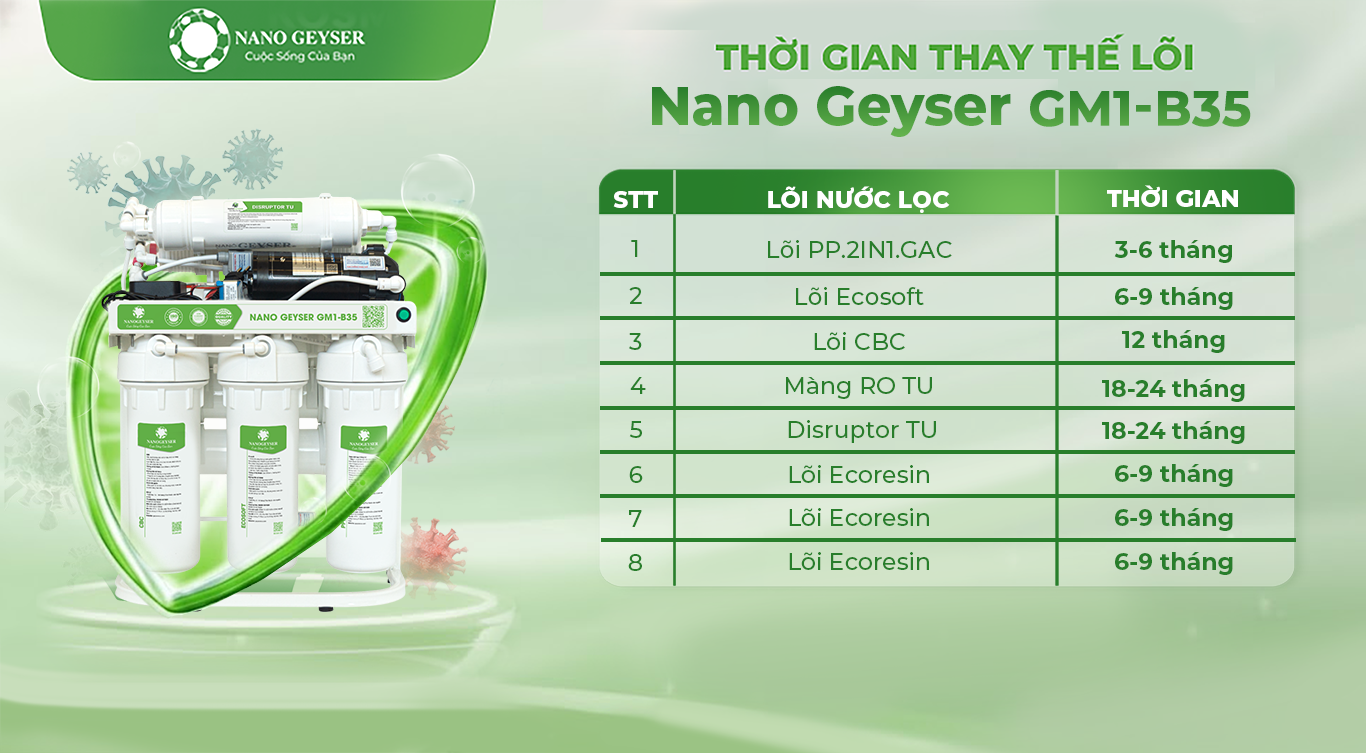 Để duy trì hiệu suất lọc tối ưu và đảm bảo chất lượng nước luôn đạt chuẩn uống trực tiếp, việc thay lõi lọc đúng định kỳ là vô cùng quan trọng. Mỗi lõi trong hệ thống máy lọc nước Nano Geyser đảm nhận một chức năng riêng biệt — từ loại bỏ tạp chất, hấp phụ hóa chất đến diệt khuẩn và tái khoáng. Vì vậy, tuân thủ lịch thay lõi không chỉ giúp kéo dài tuổi thọ máy mà còn đảm bảo nguồn nước tinh khiết, an toàn cho sức khỏe cả gia đình. Quý khách hàng vui lòng tham khảo lịch thay lõi định kỳ sau đây