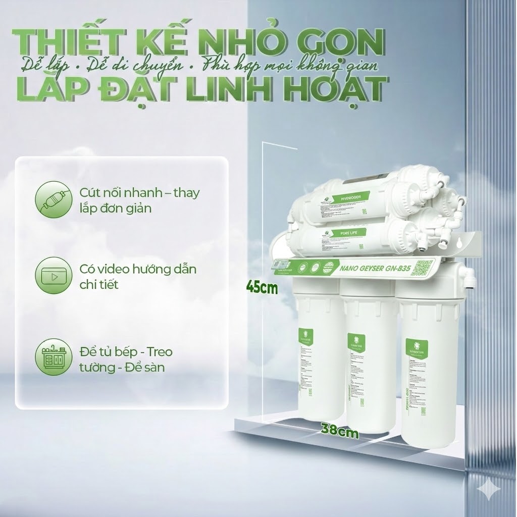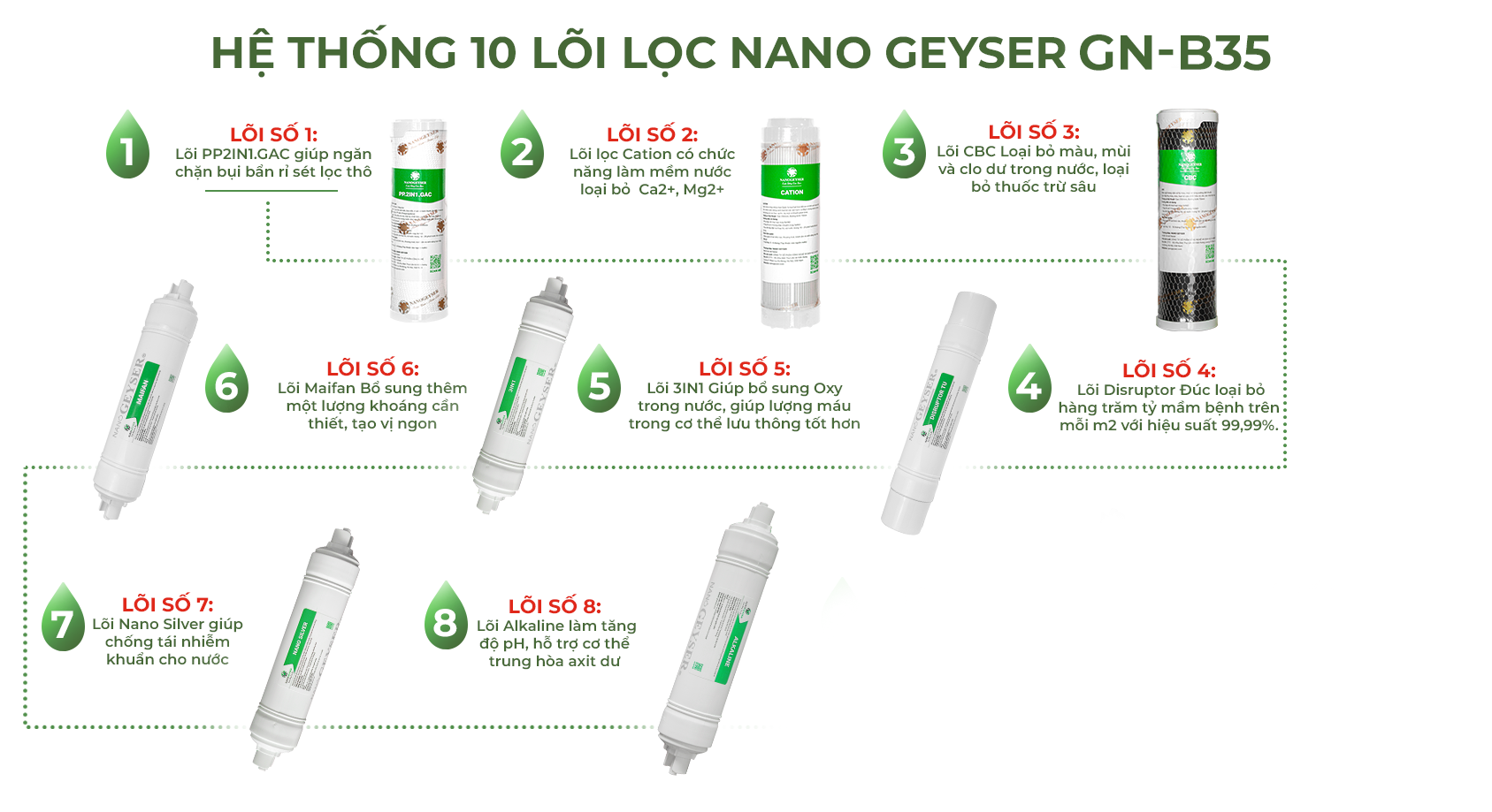 Máy lọc nước Nano Geyser GN-B35 8 cấp là mẫu sản được tích hợp công nghệ lọc số 1 tại Mỹ Nano Disruptor giúp đảm bảo nguồn nước SẠCH - AN TOÀN - ĐẠT CHUẨN - GIÀU KHOÁNG CHẤT TỰ NHIÊN.