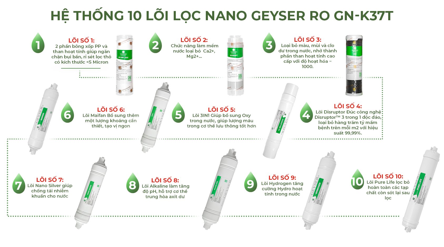Vượt trội với hệ thống 10 cấp lọc trong hệ thống lõi lọc chính hãng của Nano Geyser bao gồm: