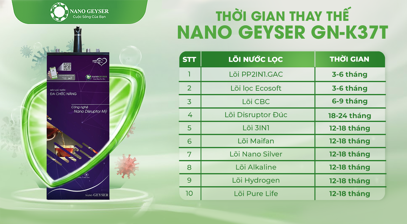 Để duy trì hiệu suất lọc tối ưu và đảm bảo chất lượng nước luôn đạt chuẩn uống trực tiếp, việc thay lõi lọc đúng định kỳ là vô cùng quan trọng. Mỗi lõi trong hệ thống máy lọc nước Nano Geyser đảm nhận một chức năng riêng biệt — từ loại bỏ tạp chất, hấp phụ hóa chất đến diệt khuẩn và tái khoáng. Vì vậy, tuân thủ lịch thay lõi không chỉ giúp kéo dài tuổi thọ máy mà còn đảm bảo nguồn nước tinh khiết, an toàn cho sức khỏe cả gia đình..png)