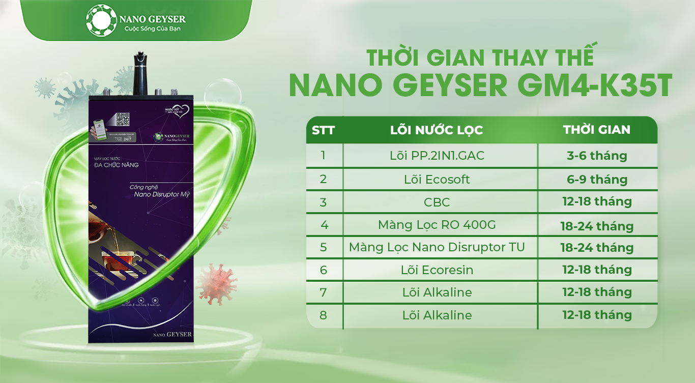 Để duy trì hiệu suất lọc tối ưu và đảm bảo chất lượng nước luôn đạt chuẩn uống trực tiếp, việc thay lõi lọc đúng định kỳ là vô cùng quan trọng. Mỗi lõi trong hệ thống máy lọc nước Nano Geyser đảm nhận một chức năng riêng biệt — từ loại bỏ tạp chất, hấp phụ hóa chất đến diệt khuẩn và tái khoáng. Vì vậy, tuân thủ lịch thay lõi không chỉ giúp kéo dài tuổi thọ máy mà còn đảm bảo nguồn nước tinh khiết, an toàn cho sức khỏe cả gia đình.